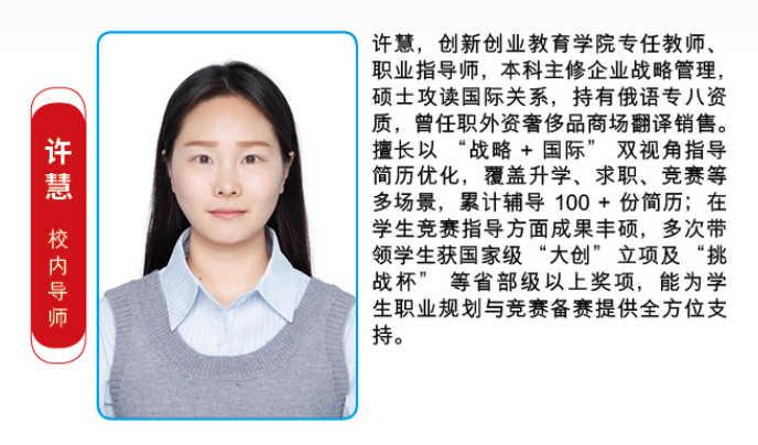 2.校内导师:由“尚行・小马生涯工作室”就业指导工作室专家老师组成,该工作室由我校与高顿集团共建,已成功获批立项教育部第四期“供需对接就业育人”项目,该专家团队具备专业的就业指导资质和丰富的实战经验,深耕就业指导工作,了解毕业生群体特点,擅长简历优化、职业规划等指导内容。