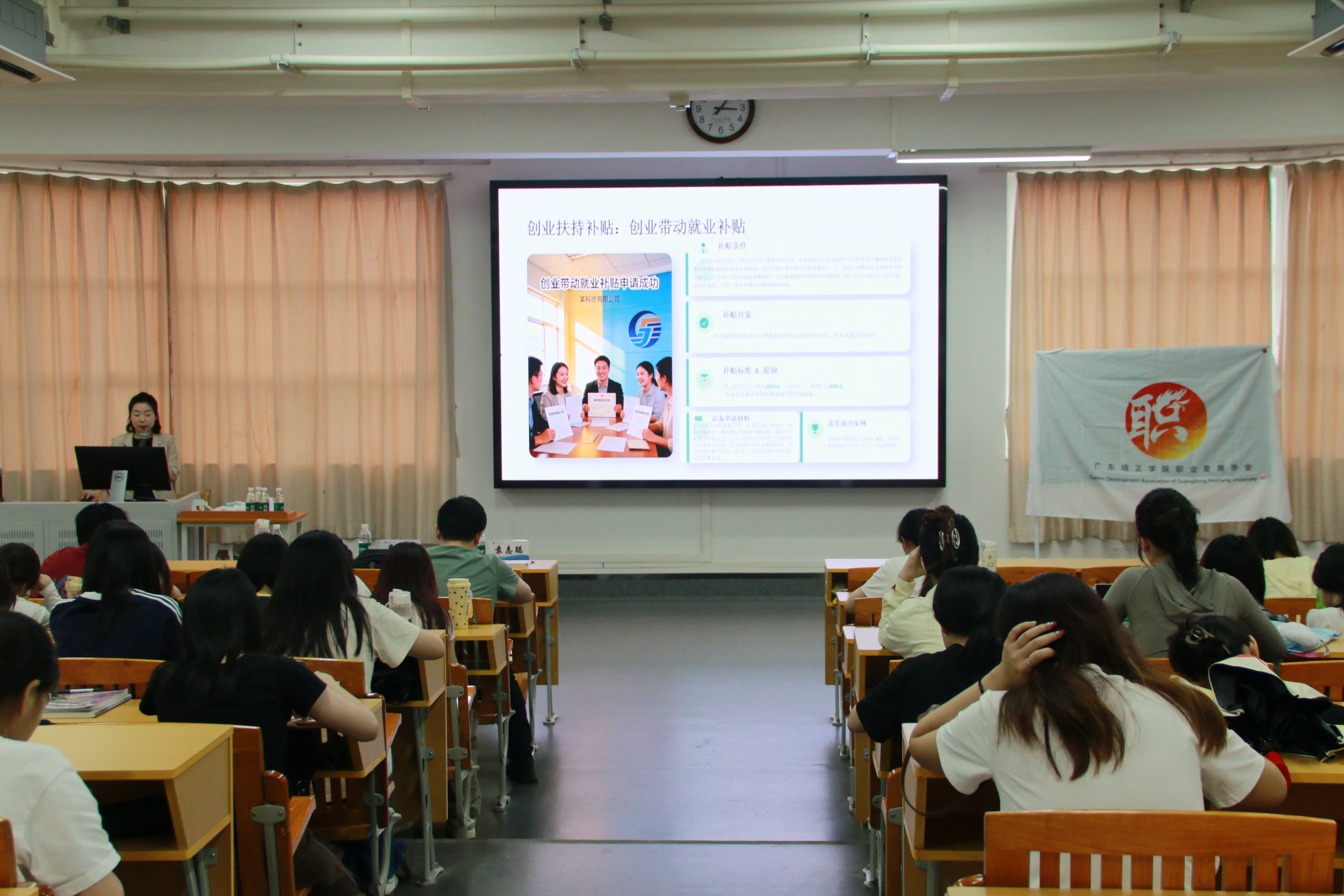 随后,吴晓晖科长聚焦学子关注的就业创业补贴、创业担保贷款两大核心政策,结合花都区就业创业数据、大学生创业典型案例,系统解读一次性创业资助、创业租金补贴、创业带动就业补贴等扶持政策,生动阐释政府通过财政补贴、贷款贴息等举措完善就业保障网的实践。她叮嘱学子,要把握毕业2年内的黄金时期,结合专业特长与职业规划,合理运用扶持政策和公共服务资源,筑牢就业创业基础。