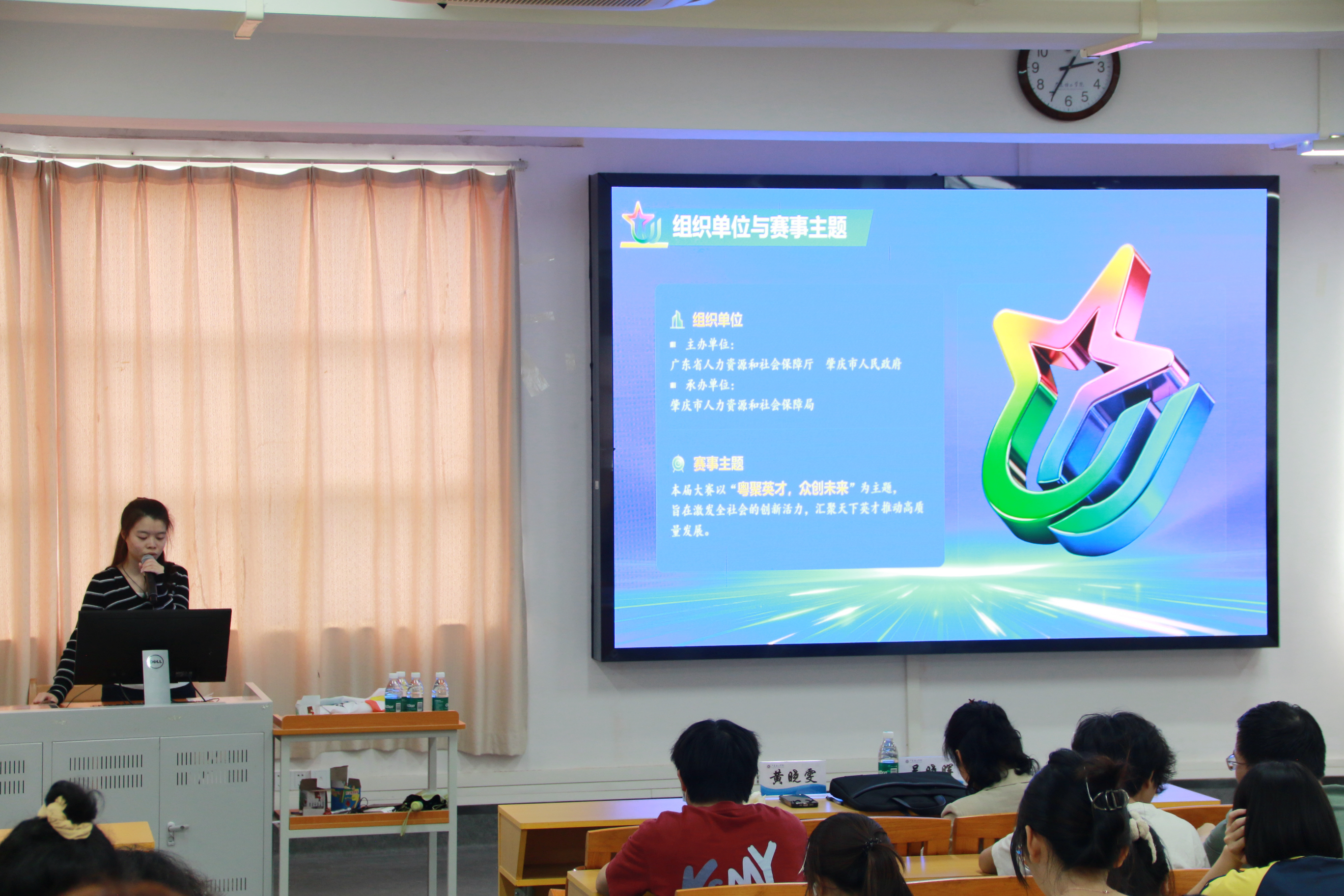 宣讲环节,黄晓雯首先解读了2026年广东“众创杯”创业大赛。作为大湾区极具影响力的省级双创标杆赛事,本届大赛以“粤聚英才,众创未来”为主题,采用“4+2”赛道模式,覆盖科技成果转化、人工智能OPC、青年创新实践等前沿领域,契合大学生双创需求。她介绍,大赛不仅设有最高50万元的资金资助及荣誉表彰,更构建全链条扶持体系,从项目展示、资源对接至政策落实、后续服务,全方位为参赛学子保驾护航,并鼓励学子勇于创新,借助赛事平台将灵感转化为创业行动,抢抓大湾区发展机遇。